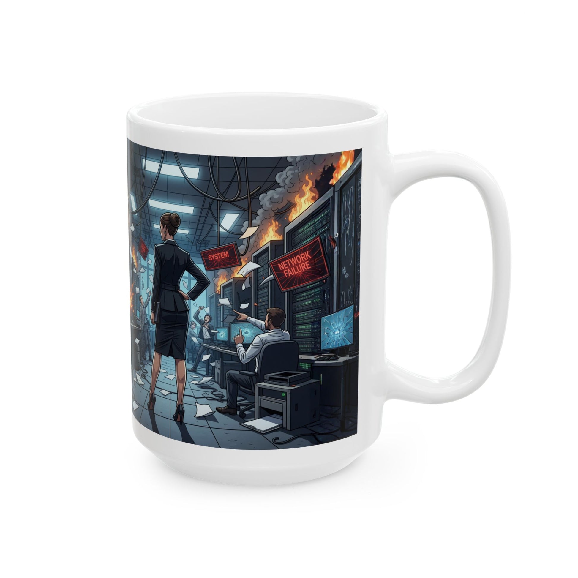 A glossy ceramic mug that captures a quiet, fierce moment of leadership. The illustration shows a female executive standing calm in a control room as alarms flare and systems fail — she’s steady, decisive, and strangely serene. Each sip feels like a reminder to breathe, think clearly, and take charge. The mug’s bright, high‑definition print keeps those colors sharp so the scene reads from across the desk. It belongs on the table of someone who values composure under pressure — a badge of competence for morning coffee, late-night shifts, or thoughtful breaks between meetings.