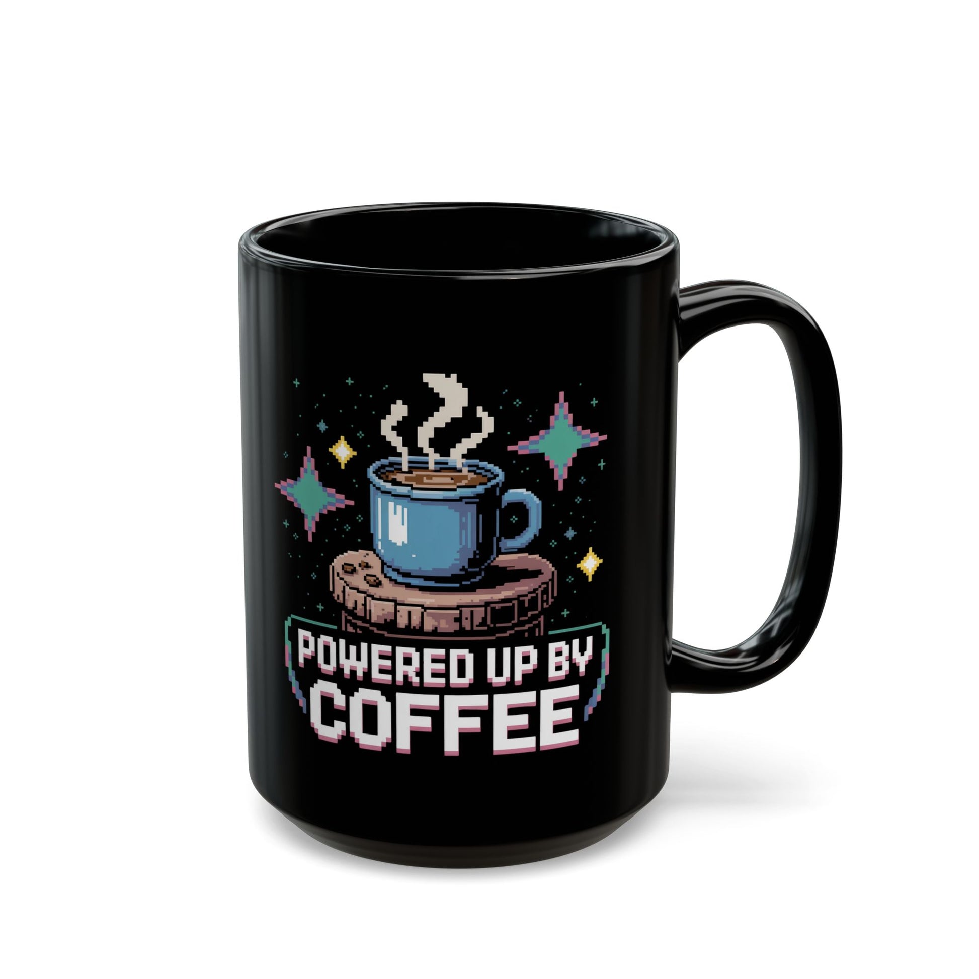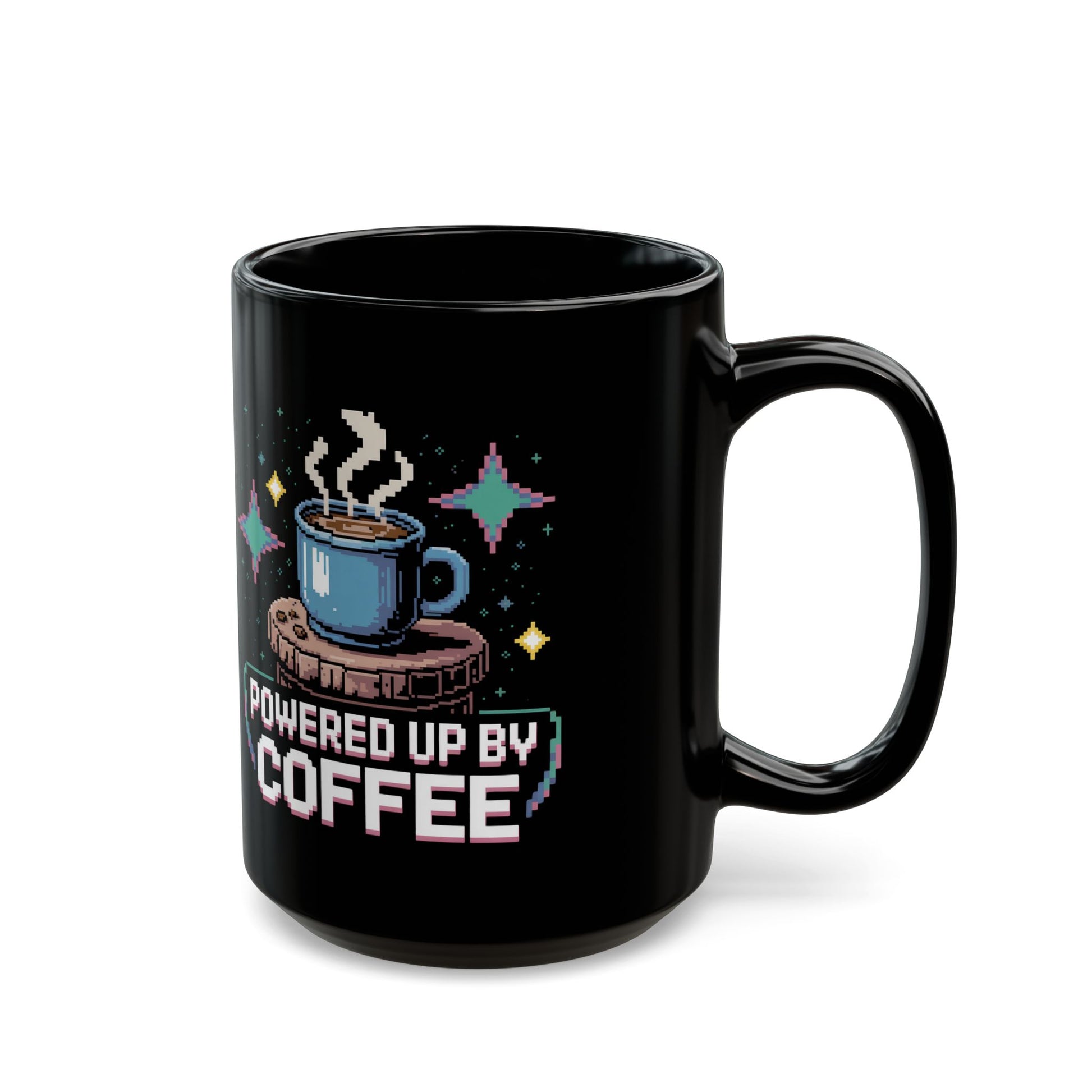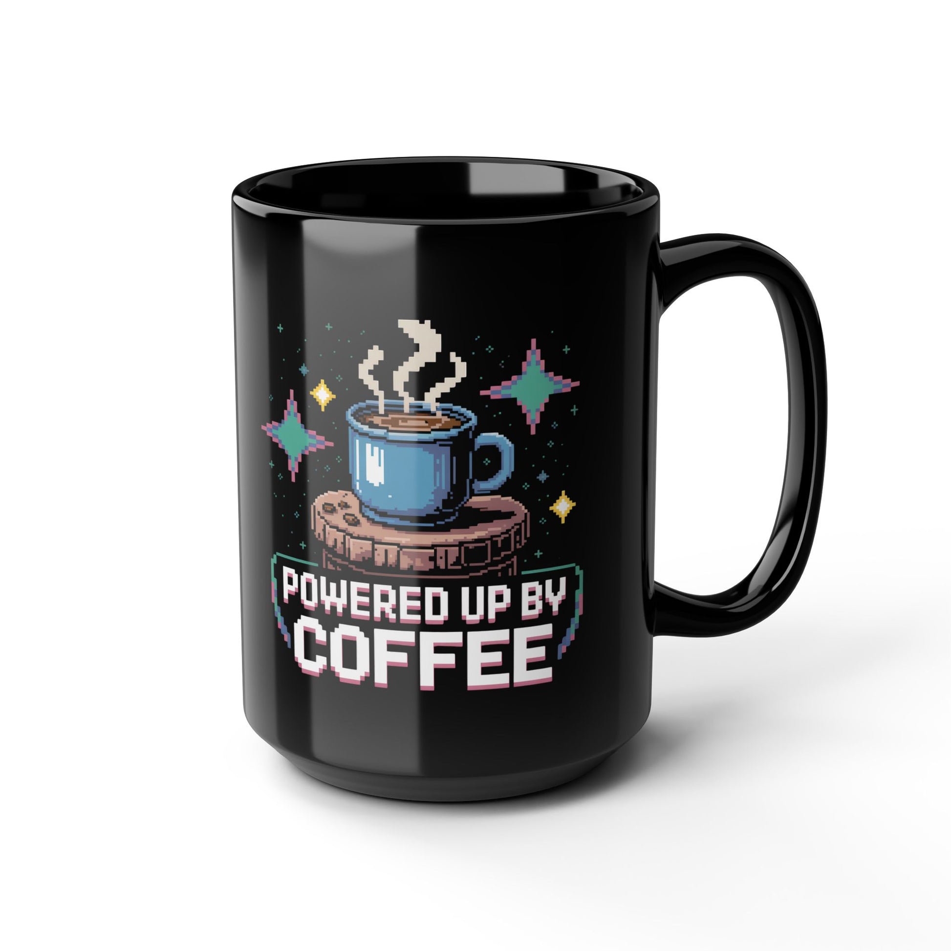 Coffee Lover's Black Mug, Powered Up by Coffee, Gift for Coffee Enthusiasts, Cozy Vibes, Fun Home Office Decor, Birthday Gift