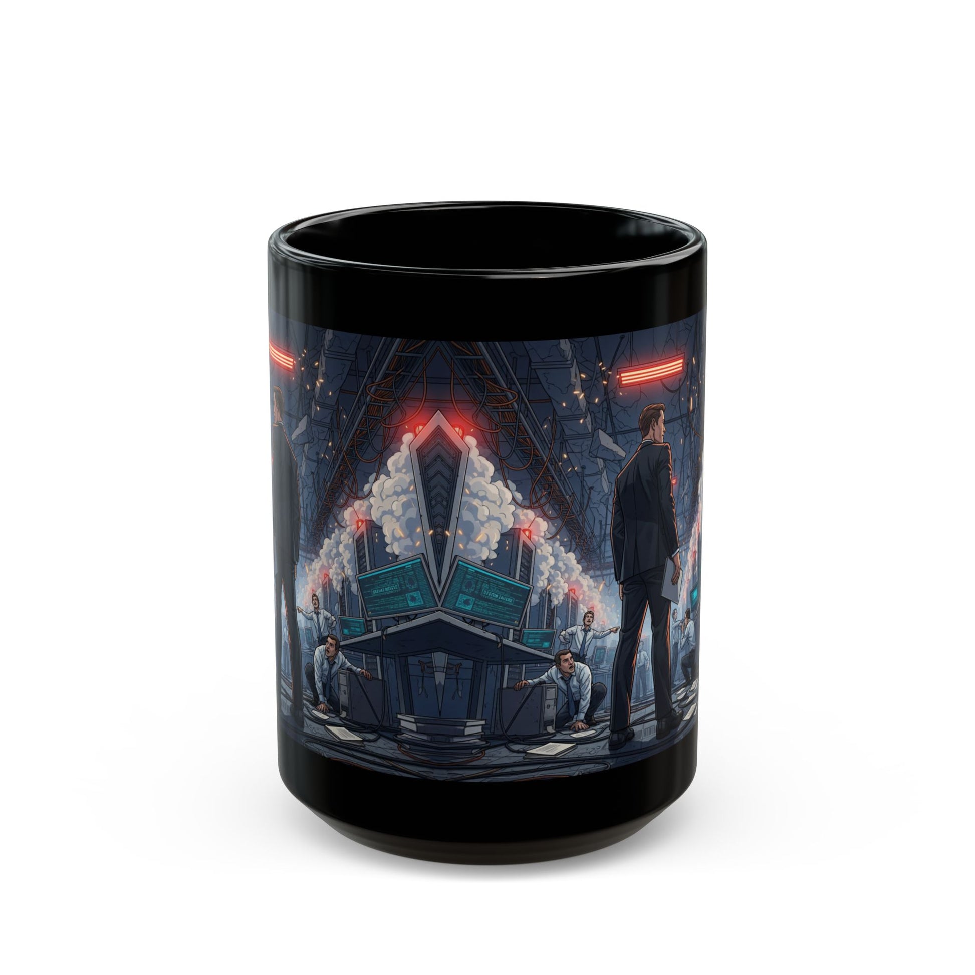 Steam hums in the server room. He stands calm amid blinking lights and tangled cabling, coffee warming his hands as systems scramble to come back online. This black ceramic mug carries that moment — steady, focused, and a little heroic. The glossy surface makes the printed scene pop: a sharp, detailed silhouette of an executive overseeing the chaos. It’s the kind of mug an IT lead reaches for during long maintenance nights, a companion for late-shift problem-solving, and a quiet reminder that composure matters when everything else is flaring red. Use it during on-call shifts, deployment nights, or whenever you need a grounded sip before diving back into the console.