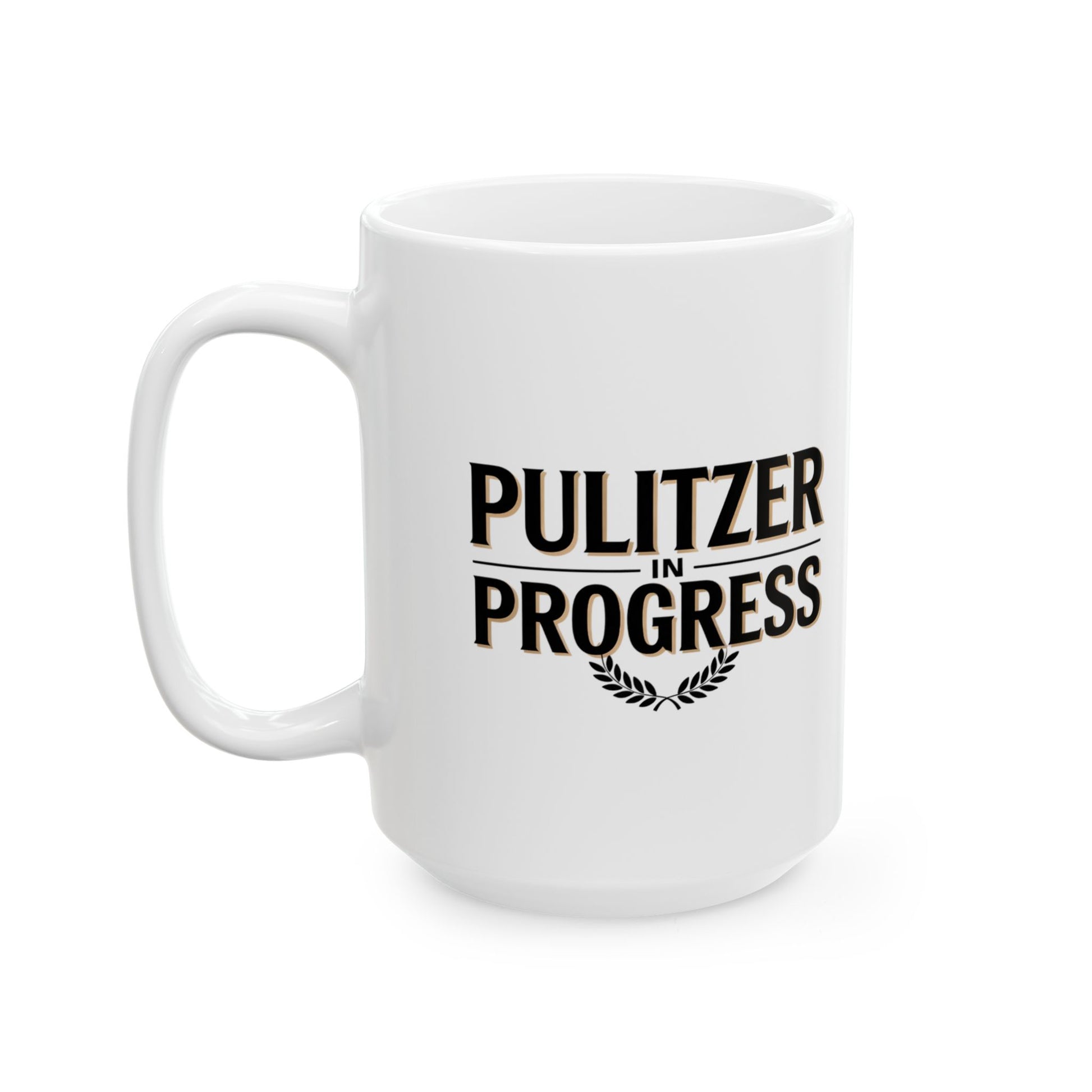 Pulitzer in Progress Mug by Lair Gadgets – 15 oz White Ceramic Coffee Cup for Writers, Journalists, and Authors