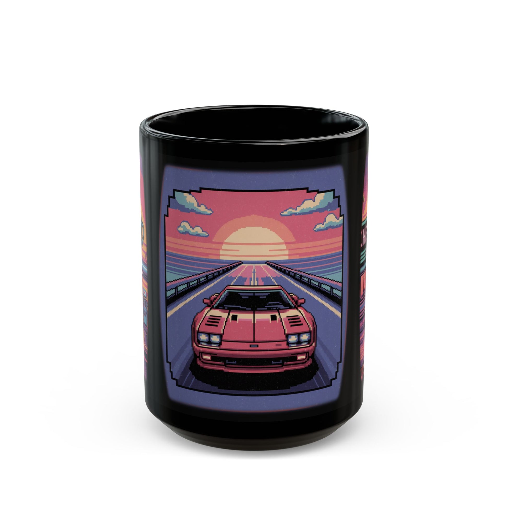 Retro Sunset Car Mug, 80s Aesthetic Coffee Cup, Vintage Car Lover Gift, Road Trip Funware, Perfect for Gamers and Nostalgia Seekers