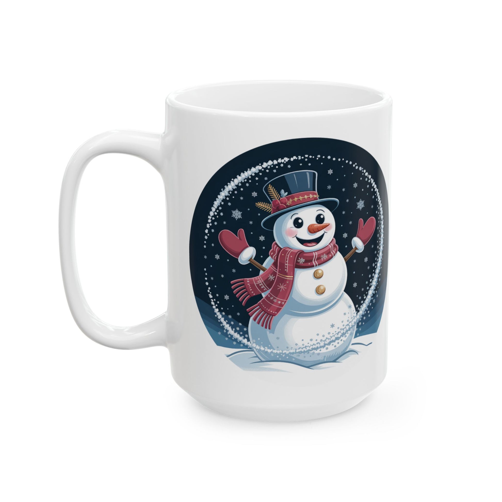 Warm up your winter mornings with the Snowy Cheer Snowman Mug by Lair Gadgets — a bright and joyful design that brings the holiday spirit to every sip. This 15 oz ceramic mug features a smiling snowman in a red scarf and mittens, framed by a sparkling swirl of snowflakes under a starry night sky. The vibrant artwork pops against the glossy white ceramic, creating a perfect blend of warmth, whimsy, and seasonal charm.
