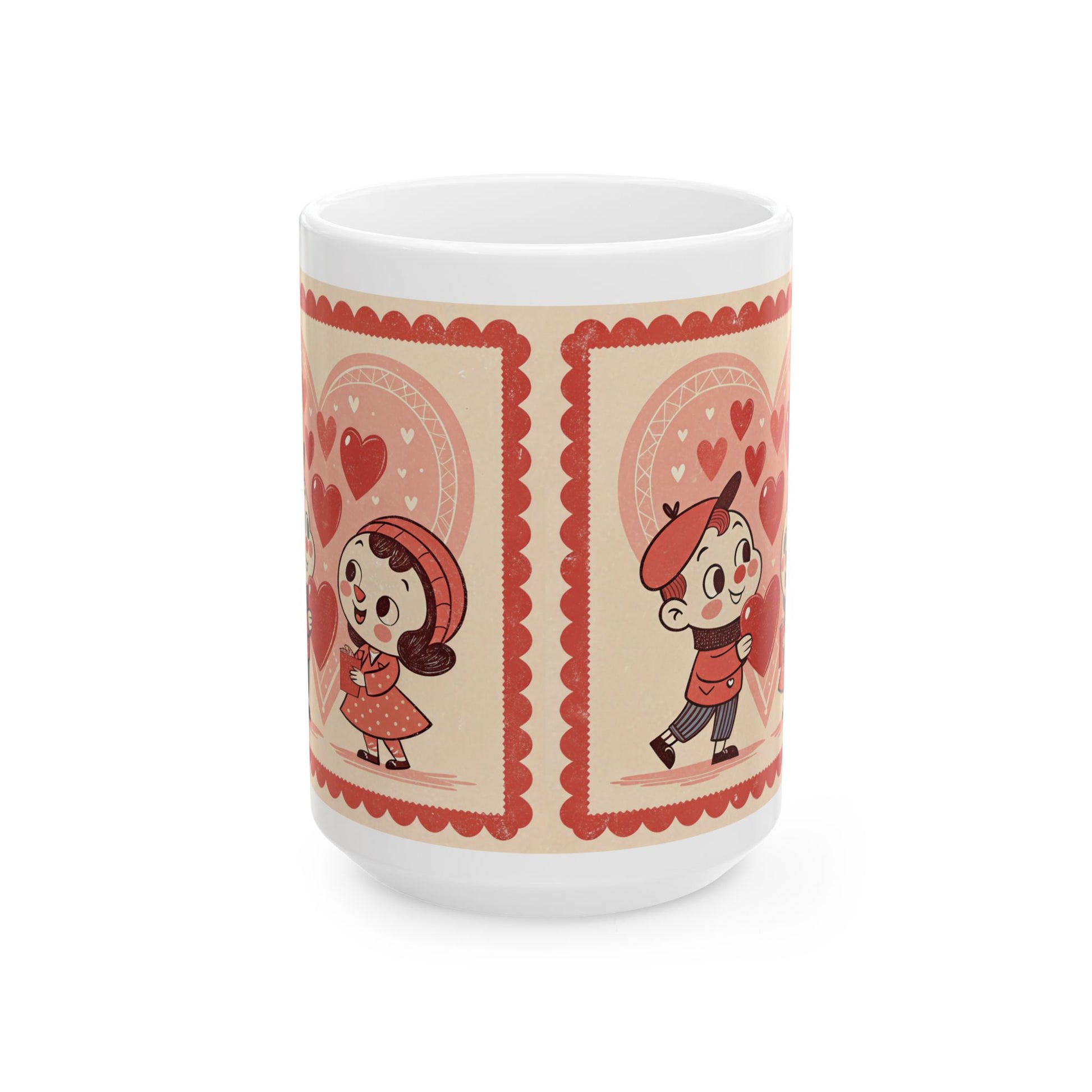 Warm, nostalgic, and a little playful — this ceramic mug brings vintage valentine vibes to your morning coffee or evening tea. Soft cream and rosy tones frame two cheerful kids in retro outfits, framed like old postage stamps. Hold it and you’ll feel a small, happy story unfold: a shy smile, a secret note, the kind of cozy sweetness that makes slow mornings feel special. It sits comfortably in your hands, brightening daily routines or quiet moments with a gentle, sentimental charm.